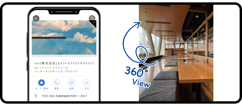 お店や会社、施設などの基本情報(住所・電話番号・営業時間)や写真等の情報を、Google検索およびマップ上に公開し、最新情報をアプローチできます。お店や会社などの位置や最新の情報などをリアルタイムでアプローチすることができ、同時に「経路案内」もしてくれるのでGoogleマップを利用するユーザーも多く、新規ユーザーの集客につながります。店内や施設などを360°カメラで全体を撮影し投稿!室内の印象をアピールすることが可能になります。