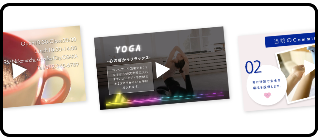 30秒から1分ほどの動画で、会社やお店の紹介や、商品やサービス内容をギュッと凝縮して、「魅力をしっかりと伝える」動画の効果を最大限活かしましょう!言葉や文字にすると難解になりがちなことでも、動画を見るとスムーズに理解してもらえることが多くあります。商品やサービスの紹介、会社やお店の魅力をしっかりと伝え、視覚や聴覚に訴えかけて誰にでもリアルに近い雰囲気を伝えることができます。